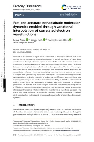 Atalar, K; Rath, Y; Crespo-Otero, R; Booth, G H (2024) Fast and accurate nonadiabatic molecular dynamics enabled through variational interpolation of correlated electron wavefunctions. Faraday Discussions, 254. pp. 542-569.