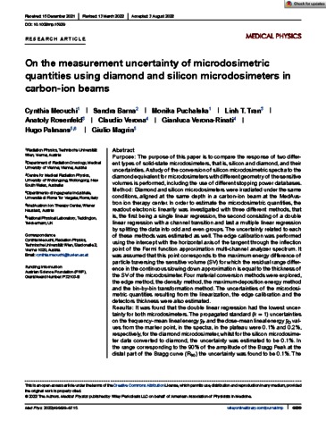 Meouchi, C; Barna, S; Puchalska, M; Tran, L T; Rosenfeld, A; Verona, C; Verona-Rinati, G; Palmans, H; Magrin, G (2022) On the measurement uncertainty of microdosimetric quantities using diamond and silicon microdosimeters in carbon-ion beams. Medical Physics, 49 (10). pp. 6699-6717.