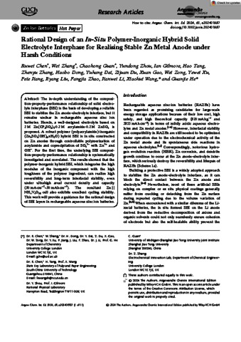 Chen, R; Zhang, W; Guan, C; Zhou, Y; Gilmore, I; Tang, H; Zhang, Z; Dong, H; Dai, Y; Du, Z; Gao, X; Zong, W; Xu, Y; Jiang, P; Liu, J; Zhou, F; Li, J; Wang, X; He, G (2024) Rational design of an in-situ polymer-inorganic hybrid solid electrolyte interphase for realising stable Zn metal anode under harsh conditions. Angewandte Chemie International Edition, 63 (21). e202401987