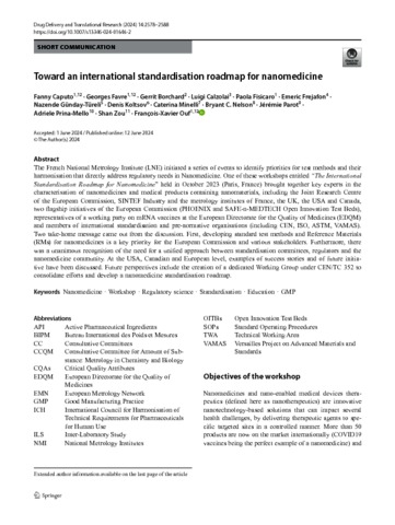 The French National Measurement Institute (LNE) initiated a series of events to identify priorities for test methods and their harmonisation that directly address regulatory needs in Nanomedicine. One of these workshops-+- entitled "The International Standardisation Roadmap for Nanomedicine" held in October 2023 (Paris, France) brought together key experts in the characterisation of nanomedicines and medical products containing nanomaterials, including the Joint Research Centre of the European Commission, SINTEF Industry and the metrology institutes of France, the UK, the USA and Canada. The participants also included representatives from two flagship initiatives of the European Commission that support innovation in nanotechnology-based health products (PHOENIX and SAFE-n-MEDTECH Open Innovation Test Beds), representatives of a working party on mRNA vaccines at the European Directorate for the Quality of Medicines (EDQM) and members of international standardisation and pre-normative organisations (including CEN, ISO, ASTM, VAMAS). The event provided a unique opportunity for the 74 participants, predominantly from industry, to deliberate on how EU funded Open Innovation Test Beds (OITBs), metrology institutes and the standardisation community could support and accelerate the commercialisation of nanomedicine-based products. It also served as a platform to gain insights into ongoing initiatives and to advocate for a more active role of the European Metrology community in fostering connections among the diverse stakeholders involved.