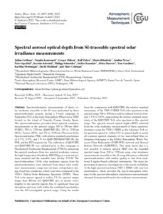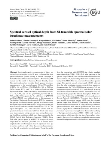 Grobner, J; Kouremeti, N; Hulsen, G; Zuber, R; Ribnitzky, M; Nevas, S; Sperfeld, P; Schuind, K; Schneider, P; Kazadzis, S; Barreto, A; Gardiner, T; Mottungan, K; Medland, D; Coleman, M (2023) Spectral Aerosol Optical Depth from SI-Traceable Spectral Solar Irradiance Measurements. Atmospheric Measurement Techniques, 16 (19). pp. 4667-4680.