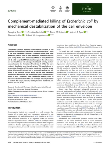 Benn, G; Bortolini, C; Roberts, D M; Pyne, A L B; Holden, S; Hoogenboom, B W (2024) Complement-mediated killing of Escherichia Coli by mechanical destabilization of the cell envelope. The EMBO Journal, 43. pp. 6152-6160.