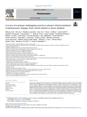 Assi, H; Cao, R; Castelino, M; Cox, B; Gilbert, F J; Grohl, J; Gurusamy, K; Hacker, L; Ivory, A; Joseph, J; Knieling, F; Leahy, M J; Lilaj, L; Manohar, S; Meglinski, I; Moran, C; Murray, A; Oraevsky, A A; Pagel, M D; Pramanik, M; Raymond, J; Singh, M K A; Vogt, W C; Wang, L; Yang, S; Bohndiek, S E (2023) A review of a strategic roadmapping exercise to advance clinical translation of photoacoustic imaging: From current barriers to future adoption. Photoacoustics, 32. 100539