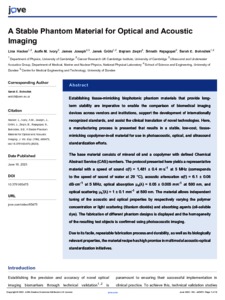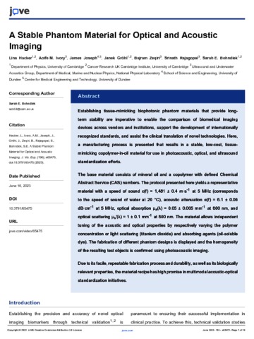 Hacker, L; Ivory, A M; Joseph, J; Grohl, J; Zeqiri, B; Rajagopal, S; Bohndiek, S E (2023) A Stable Phantom Material for Optical and Acoustic Imaging. Journal of Visualized Experiments, 196. e65475