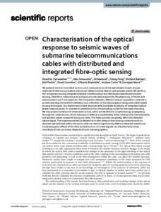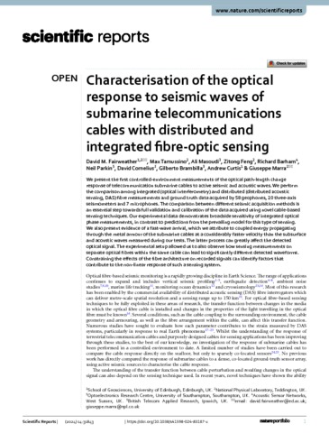 Fairweather, D; Tamussino, M; Masoudi, A; Feng, Z; Barham, R; Parkin, N; Cornelius, D; Brambilla, G; Curtis, A; Marra, G (2024) Characterisation of the optical response to seismic waves of submarine telecommunications cables with distributed and integrated fibre-optic sensing. Scientific Reports, 14. 31843