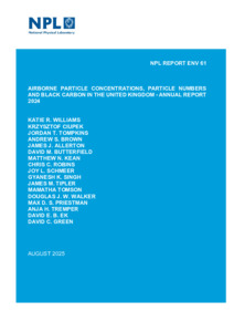 Williams, K R; Ciupek, K; Tompkins, J T; Brown, A S; Allerton, J J; Butterfield, D M; Kean, M N; Robins, C C; Schmeer, J L; Singh, G K; Tipler, J M; Tomson, M; Walker, D J W; Priestman, M D S; Tremper, A H; Ek, D E B; Green, D C (2025) Airborne Particle Concentrations, Particle Numbers and Black Carbon in the United Kingdom - Annual Report 2024. NPL Report. ENV 61