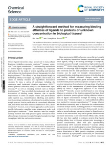 Yan, B; Bunch, J (2025) A straightforward method for measuring binding affinities of ligands to proteins of unknown concentration in biological tissues. Chemical Science, 16 (20). pp. 8673-8681. ISSN 2041-6520