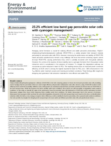 Perera, W H K; Webb, T; Xu, Y; Zhu, J; Zhou, Y; Trindade, G F; Masteghin, M G; Harvey, S P; Jenatsch, S; Dai, L; Sathasivam, S; Macdonald, T J; Hinder, S J; Zhao, Y; Stranks, S D; Zhao, D; Zhang, W; Jayawardena, K D G I; Haque, S A; Silva, S R P (2025) 23.2% efficient low band gap perovskite solar cells with cyanogen management. Energy & Environmental Science, 18 (1). pp. 439-453. ISSN 1754-5692