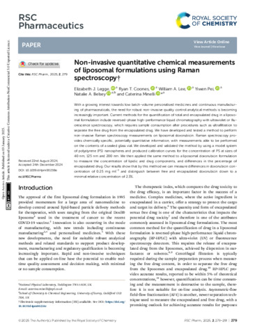 Legge, E J; Coones, R T; Lee, W A; Pei, Y; Belsey, N A; Minelli, C (2025) Non-invasive quantitative chemical measurements of liposomal formulations using Raman spectroscopy. RSC Pharmaceutics, 2 (2). pp. 279-291. ISSN 2976-8713
