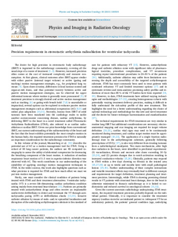 The desire for high precision in stereotactic body radiotherapy (SBRT) is ingrained in the radiotherapy community, covering all the usual steps of a course of treatment [1–3]. However, increased precision often comes at the cost of increased complexity and resource con�sumption. At first glance, clinical outcomes after SBRT appear similar with either passive (internal target volume) or active (gating and tracking) motion management strategies, e.g., for peripheral lung tu�mours [4]. Upon closer scrutiny, differences in local tumour control and organ-at-risk doses, and thus potential toxicity between active and passive motion management strategies, can be observed for upper abdominal tumours where motion is generally more pronounced [5]. If treatment precision is strongly desired and active motion management such as tracking [6] or gating with breath hold [7,8] is unavailable or impractical, several options can be explored to enhance passive motion management strategies such as abdominal compression (AC) [8,9] and online plan adaptation [10,11]. Recently, lessons from SBRT of solid tumours have been translated into the cardiology realm to tackle another socioeconomic concerning disease, cardiac arrhythmias, by delivering SBRT to the heart in a novel treatment called STereotactic Arrhythmia Radioablation (STAR), also referred to as cardiac radio�ablation or cardiac SBRT. Given our prior knowledge from conventional SBRT, our current understanding of the radiosensitivity of the heart and the fact that the heart exhibits potentially the most complex motion in the human body, the required treatment precision for STAR is naturally an important consideration for the radiotherapy community.
