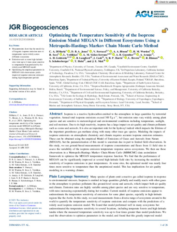 DiMaria, C A; Jones, D B A; Ferracci, V; Bloom, A A; Worden, H M; Seco, R; Vettikkat, L; Yáñez‐Serrano, A M; Guenther, A B; Araujo, A; Goldstein, A H; Langford, B; Cash, J; Harris, N R P; Brown, L; Rinnan, R; Schobesberger, S; Holst, T; Mak, J E (2025) Optimizing the Temperature Sensitivity of the Isoprene Emission Model MEGAN in Different Ecosystems Using a Metropolis‐Hastings Markov Chain Monte Carlo Method. Journal of Geophysical Research: Biogeosciences, 130 (5). e2025JG008806 ISSN 2169-8953