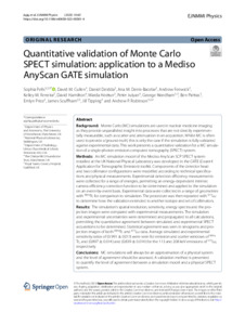 The simulation’s spatial resolution, sensitivity, energy spectra and the projection images were compared with experimental measurements. The simulation and experimental uncertainties were determined and propagated to all calculations, permitting the quantitative agreement between simulated and experimental SPECT acquisitions to be determined. Statistical agreement was seen in sinograms and projection images of both $$^{99\text {m}}$$ 99 m Tc and $$^{177}$$ 177 Lu data. Average simulated and experimental sensitivity ratios of ( $$0.991 \pm 0.011$$ 0.991 ± 0.011 ) were seen for emission and scatter windows of $$^{99\text {m}}$$ 99 m Tc, and ( $$0.897 \pm 0.014$$ 0.897 ± 0.014 ) and ( $$0.839 \pm 0.014$$ 0.839 ± 0.014 ) for the 113 and 208 keV emissions of $$^{177}$$ 177 Lu, respectively.
