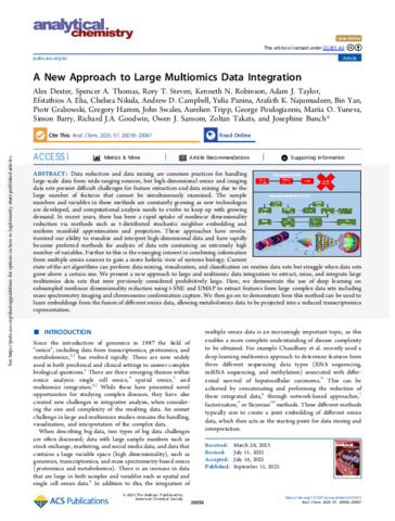 Dexter, A; Thomas, S A; Steven, R T; Robinson, K N; Taylor, A J; Elia, E A; Nikula, C; Campbell, A D; Panina, Y; Najumudeen, A K; Yan, B; Grabowski, P; Hamm, G; Swales, J; Tripp, A; Poulogiannis, G; Yuneva, M O; Barry, S; Goodwin, R J A; Sansom, O J; Takats, Z; Bunch, J (2025) A New Approach to Large Multiomics Data Integration. Analytical Chemistry, 97 (37). pp. 20058-20067. ISSN 0003-2700