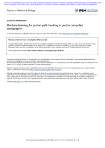 A Machine Learning approach to the problem of calculating the proton paths inside a scanned object in proton Computed Tomography is presented. The method is developed in order to mitigate the loss in both spatial resolution and quantitative integrity of the reconstructed images caused by multiple Coulomb scattering of protons traversing the matter. Two Machine Learning models were used: a forward neural network and the XGBoost method. A heuristic approach, based on track averaging was also implemented in order to evaluate the accuracy limits on track calculation, imposed by the statistical nature of the scattering. Synthetic data from anthropomorphic voxelized phantoms, generated by the Monte Carlo Geant4 code, were utilised to train the models and evaluate their accuracy, in comparison to a widely used analytical method that is based on likelihood maximization and Fermi-Eyges scattering model. Both neural network and XGBoost model were found to perform very close or at the accuracy limit, further improving the accuracy of the analytical method (by 12% in the typical case of 200MeV protons on 20 cm of water object), especially for protons scattered at large angles. Inclusion of the material information along the path in terms of radiation length did not show improvement in accuracy for the phantoms simulated in the study. A neural network was also constructed to predict the error in path calculation, thus enabling a criterion to filter out proton events that may have a negative effect on the quality of the reconstructed image. By parametrizing a large set of synthetic data, the Machine Learning models were proved capable to bring - in an indirect and time efficient way - the accuracy of the Monte Carlo method into the problem of proton trackingA Machine Learning approach to the problem of calculating the proton paths inside a scanned object in proton Computed Tomography is presented. The method is developed in order to mitigate the loss in both spatial resolution and quantitative integrity of the reconstructed images caused by multiple Coulomb scattering of protons traversing the matter. Two Machine Learning models were used: a forward neural network and the XGBoost method. A heuristic approach, based on track averaging was also implemented in order to evaluate the accuracy limits on track calculation, imposed by the statistical nature of the scattering. Synthetic data from anthropomorphic voxelized phantoms, generated by the Monte Carlo Geant4 code, were utilised to train the models and evaluate their accuracy, in comparison to a widely used analytical method that is based on likelihood maximization and Fermi-Eyges scattering model. Both neural network and XGBoost model were found to perform very close or at the accuracy limit, further improving the accuracy of the analytical method (by 12% in the typical case of 200MeV protons on 20 cm of water object), especially for protons scattered at large angles. Inclusion of the material information along the path in terms of radiation length did not show improvement in accuracy for the phantoms simulated in the study. A neural network was also constructed to predict the error in path calculation, thus enabling a criterion to filter out proton events that may have a negative effect on the quality of the reconstructed image. By parametrizing a large set of synthetic data, the Machine Learning models were proved capable to bring - in an indirect and time efficient way - the accuracy of the Monte Carlo method into the problem of proton trackingA Machine Learning approach to the problem of calculating the proton paths inside a scanned object in proton Computed Tomography is presented. The method is developed in order to mitigate the loss in both spatial resolution and quantitative integrity of the reconstructed images caused by multiple Coulomb scattering of protons traversing the matter. Two Machine Learning models were used: a forward neural network and the XGBoost method. A heuristic approach, based on track averaging was also implemented in order to evaluate the accuracy limits on track calculation, imposed by the statistical nature of the scattering. Synthetic data from anthropomorphic voxelized phantoms, generated by the Monte Carlo Geant4 code, were utilised to train the models and evaluate their accuracy, in comparison to a widely used analytical method that is based on likelihood maximization and Fermi-Eyges scattering model. Both neural network and XGBoost model were found to perform very close or at the accuracy limit, further improving the accuracy of the analytical method (by 12% in the typical case of 200MeV protons on 20 cm of water object), especially for protons scattered at large angles. Inclusion of the material information along the path in terms of radiation length did not show improvement in accuracy for the phantoms simulated in the study. A neural network was also constructed to predict the error in path calculation, thus enabling a criterion to filter out proton events that may have a negative effect on the quality of the reconstructed image. By parametrizing a large set of synthetic data, the Machine Learning models were proved capable to bring - in an indirect and time efficient way - the accuracy of the Monte Carlo method into the problem of proton tracking