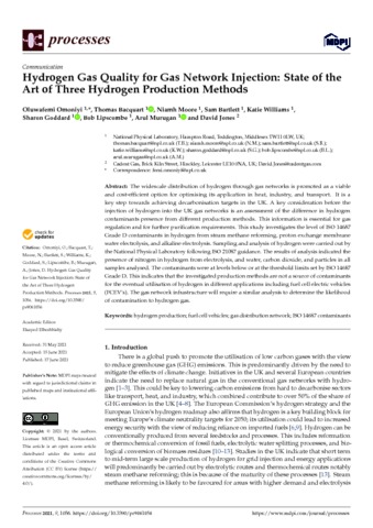 Omoniyi, O; Bacquart, T; Moore, N; Bartlett, S; Williams, K; Goddard, S; Lipscombe, B; Murugan, A; Jones, D (2021) Hydrogen Gas Quality for Gas Network Injection: State of the Art of Three Hydrogen Production Methods. Processes, 9 (6). 1056