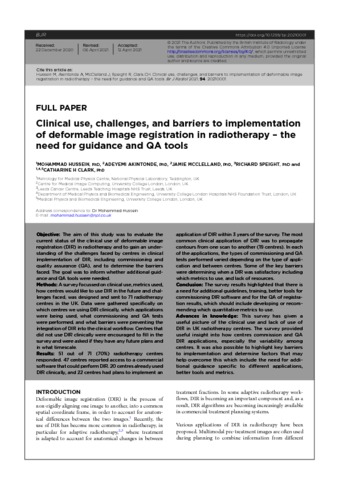 Hussein, M; Akintonde, A; McClelland, J; Speight, R; Clark, C H (2021) Clinical use, challenges, and barriers to implementation of deformable image registration in radiotherapy - the need for guidance and QA tools. British Journal of Radiology, 94 (1122). 20210001