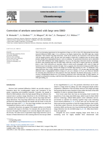 Winiarski, B; Gholinia, A; Mingard, K; Gee, M; Thompson, G; Withers, P J (2021) Correction of artefacts associated with large area EBSD. Ultramicroscopy, 226. 113315