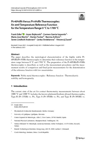 Edler, F; Bojkovski, J; Izquerdo, C G; Martin, M J; Tucker, D; Arifovic, N; Andersen, S L; Sindelarova, L; Zuzek, V (2021) Pt-40%Rh Versus Pt-6%Rh Thermocouples: An emf-Temperature Reference Function for the Temperature Range 0 degrees C to 1769 degrees C. International Journal of Thermophysics, 42 (11). 150