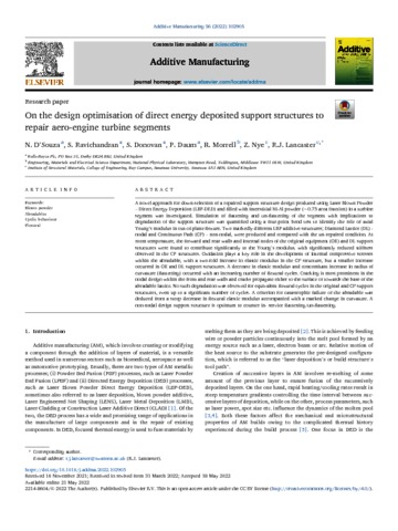 D'Souza, N; Ravichandran, S; Donovan, S; Daum, P; Morrell, R; Nye, Z; Lancaster, R J (2022) On the design optimisation of direct energy deposited support structures to repair aeroengine turbine segments. Additive Manufacturing, 56. 102905