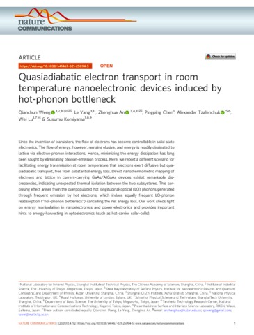 Weng, Q C; Yang, L; An, Z H; Tzalenchuk, A; Lu, W; Komiyama, S (2021) Quasiadiabatic electron transport in room temperature nanoelectronic devices induced by hot-phonon bottleneck. Nature Communications, 12 (1). 4752