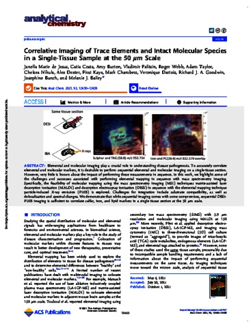 de Jesus, J M; Costa, C; Burton, A; Palitsin, V; Webb, R; Taylor, A; Nikula, C; Dexter, A; Kaya, F; Chambers, M; Dartois, V; Goodwin, R J A; Bunch, J; Bailey, M J (2021) Correlative Imaging of Trace Elements and Intact Molecular Species in a Single-Tissue Sample at the 50 μm Scale. Analytical Chemistry, 93 (40). pp. 13450-13458.