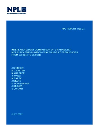 Skinner, J; Salter, M J; Ridler, N M; Wang, Y; Salek, M; Stake, J; Jayasankar, D; Hesler, J; Durant, S (2022) Interlaboratory Comparison Of S-Parameter Measurements In WM-380 Waveguide at Frequencies from 500 GHz to 750 GHz. NPL Report. TQE 23