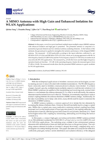 Yang, Q C; Zhang, C B; Cai, Q B; Loh, T H; Liu, G (2022) A MIMO Antenna with High Gain and Enhanced Isolation for WLAN Applications. Applied Sciences, 12 (5). 2279