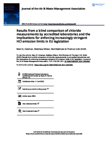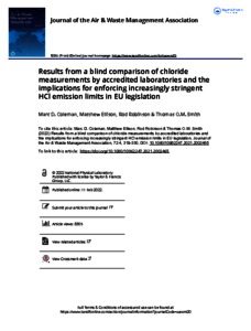 Coleman, M D; Ellison, M; Robinson, R; Smith, T O M (2022) Results from a blind comparison of chloride measurements by accredited laboratories and the implications for enforcing increasingly stringent HCl emission limits in EU legislation. Journal of the Air & Waste Management Association, 72 (4). pp. 319-330.