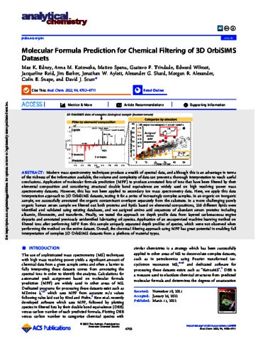 Edney, M K; Kotowska, A M; Spanu, M; Trindade, G F; Wilmot, E; Reid, J; Barker, J; Aylott, J W; Shard, A G; Alexander, M R; Snape, C E; Scurr, D J (2022) Molecular Formula Prediction for Chemical Filtering of 3D OrbiSIMS Datasets. Analytical Chemistry, 94 (11). pp. 4703-4711.