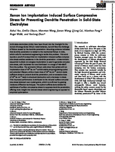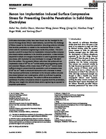 Yao, X H; Olsson, E; Wang, M M; Wang, J A; Cai, Q; Peng, N H; Webb, R; Zhao, Y L (2022) Xenon Ion Implantation Induced Surface Compressive Stress for Preventing Dendrite Penetration in Solid-State Electrolytes. Small, 18 (23). 2108124