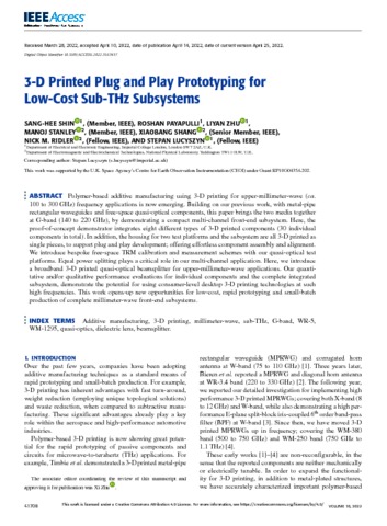 Shin, S H; Payapulli, R; Zhu, L; Stanley, M; Shang, X; Ridler, N M; Lucyszyn, S (2022) 3-D Printed Plug and Play Prototyping for Low-Cost Sub-THz Subsystems. IEEE Access, 10. pp. 41708-41719.