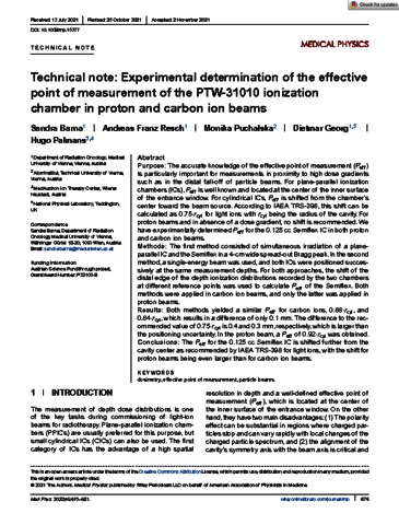 Barna, S; Resch, A F; Pushalska, M; Georg, D; Palmans, Hugo (2022) Technical note: Experimental determination of the effective point of measurement of the PTW-31010 ionization chamber in proton and carbon ion beams. Medical Physics, 49 (1). pp. 675-681.