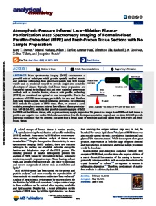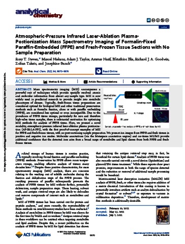 Steven, R T; Niehaus, M; Taylor, A J; Nasif, A; Elia, E; Goodwin, R J A; Tokats, Z; Bunch, J (2022) Atmospheric-pressure infrared laser-ablation plasma-post-ionisation mass spectrometry imaging of formalin-fixed paraffin embedded (FFPE) and fresh-frozen tissue sections with no sample preparation. Analytical Chemistry, 94 (28). pp. 9970-9974.