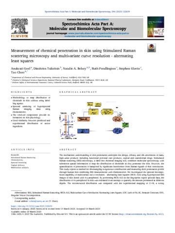 Geol, A; Tsikritsis, D; Belsey, N; Pendlington, R; Glavin, S; Chen, T (2023) Measurement of Chemical Penetration in Skin using Stimulated Raman Scattering Microscopy and Multivariate Curve Resolution - Alternating Least Squares. Spectrochimica Acta Part A: Molecular and Biomolecular Spectroscopy, 296. 122639