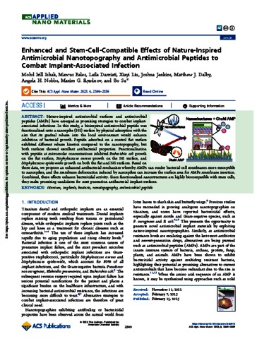 Ishak, M I; Eales, M; Damiati, L; Liu, X; Jenkins, J; Dalby, M J; Nobbs, A H; Ryadnov, M G; Su, B (2023) Enhanced and Stem-Cell-Compatible Effects of Nature-Inspired Antimicrobial Nanotopography and Antimicrobial Peptides to Combat Implant-Associated Infection. ACS Applied Nano Materials, 6 (4). pp. 2549-2559.