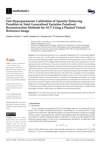 Chretien, S; Giampiccolo, C; Sun, W; Talbott, J (2021) Fast hyperparameter calibration of sparsity enforcing penalties in Total Generalised Variation penalised reconstruction methods for XCT using a planted virtual reference image. Mathematics, 9 (22). 2960