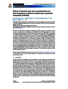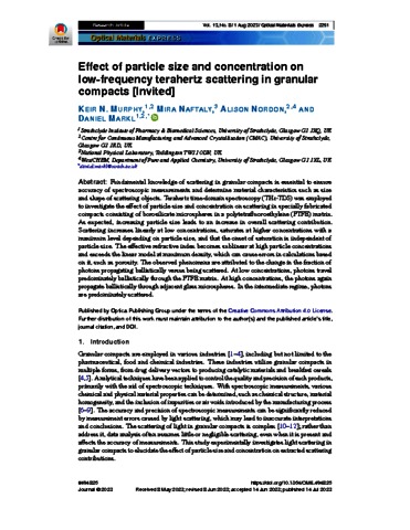 Murphy, K N; Naftaly, M; Nordon, A; Markl, D (2023) Effect of particle size and concentration on low-frequency terahertz scattering in granular compacts. Optical Materials Express, 13 (8). pp. 2251-2263.