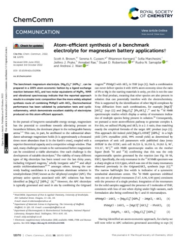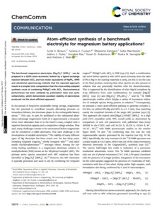 Brown, S A; Cussen, S A; Kennard, R; Marchesini, S; Pryke, J J; Rae, A; Robertson, S D; Samajdar, R N; Wain, A J (2022) Atom-efficient synthesis of a benchmark electrolyte for magnesium battery applications. Chemical Communications, 58 (86). pp. 12070-12073.