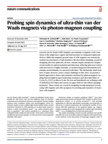 Zollitsch, C W; Khan, S; Nam, V T T; Verzhbitskiy, I A; Sagkovits, D; O'Sullivan, J; Kennedy, O W; Strungaru, M; Santos, E J G; Morton, J J L; Eda, G; Kurebayashi, H (2023) Probing spin dynamics of ultra-thin van der Waals magnets via photon-magnon coupling. Nature Communications, 14. 2619