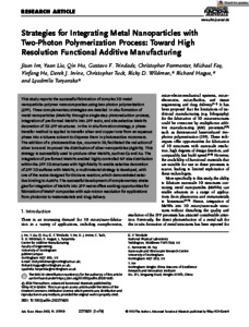 This study reports the successful fabrication of complex 3D metal nanoparticle–polymer nanocomposites using two-photon polymerization (2PP). Three complementary strategies are detailed: in situ formation of metal nanoparticles (MeNPs) through a single-step photoreduction process, integration of pre-formed MeNPs into 2PP resin, and site-selective MeNPs decoration of 3D 2PP structures. In the in situ formation strategy, a phase-transfer method is applied to transfer silver and copper ions from an aqueous phase into a toluene solvent to disperse them in photoreactive monomers.The addition of a photosensitive dye, coumarin 30, facilitated the reduction of silver ions and improved the distribution of silver nanoparticles (AgNPs). This strategy is successfully used to produce other MeNPs, such as Cu and Au. The integration of pre-formed MeNPs enabled highly controlled NP size distribution within the 2PP 3D structures with high-fidelity To enable selective decoration of 2PP 3D surfaces with MeNPs, a multimaterial strategy is developed, with one of the resins designed for thiol-ene reaction, which demonstrated selective binding to AuNPs. The successful development of complementary strategies for integration of MeNPs into 2PP resins offers exciting opportunities for fabrication of MeNP composites with sub-micron resolution for applications from photonics to metamaterials and drug delivery.